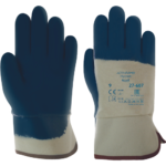 Antistatické rukavice šité z bavlneného úpletu, polomáčané v nitrile, s pevnou manžetou, vhodné pre manipuláciu s abrazívnymi materiálmi (odliatky, zvárková oceľ, tehly, apod.)