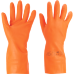 Chlórované rukavice zo 100 % prírodného 0,75 mm silného latexu bez plnidiel, s velúrovou úpravou vo vnútri, reliéfnym povrchom v dlani a na prstoch, v celkovej dĺžke 32 cm.
