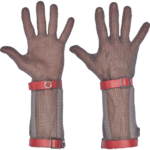 Obojručné rukavice z oceľových krúžkov, s textilným sťahovacím remienkom, chráničom predlaktia, maximálnou ochranou proti porezaniu a 15 cm širokou manžetou. 0114 0006 99 080 červená, 0114 0006 99 090 modrá, 0114 0006 99 100 oranžová, 0114 0006 99 110 fialová