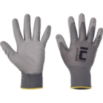 Pletené bezšvové polyesterové rukavice polomáčané, s tenkou vrstvou polyuretánu v dlani a na prstoch, elastická manžeta.