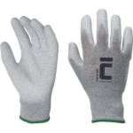 „Pletené bezšvíkové antistatické polyesterové rukavice s integrovaným uhlíkovým vláknom, vrstvou polyuretánu v dlani a na prstoch a pružnou manžetou. Hustota úpletu 15 GG