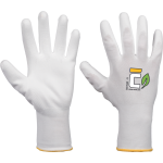 Tyto pětiprsté bezešvé rukavice jsou vyrobeny z bílé recyklované polyesterové příze a jsou prodyšné a lehké. Dlaň je máčena v bílém polyuretanu (PU) na vodní bázi pro lepší přilnavost a citlivost v prstech. Tyto rukavice jsou ideální pro přesné úkoly a kombinují výkonnost s odpovědností k životnímu prostředí. Rukavice neobsahují DMF.