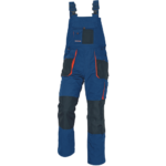 • montérkové nohavice s náprsenkou pohodlného strihu a s vysokou odolnosťou • namáhané miesta vystužené materiálom polyester 600D • zosilnené zdvojené kolená pre vloženie nákolenníkov • pútko na kladivo • vyrobené do náročných podmienok