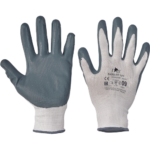 Pletené bezšvové polyesterové rukavice, dlane máčané v nitrile.