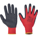 Pletené bezšvové polyesterové rukavice, máčané v čiernom latexe na dlani a na prstoch, pružná manžeta.