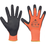 Pletené bezšvové rukavice máčané v čiernom PU v dlani a prstoch s ochranou voči prerezaniu E vhodné pre manipuláciu s ostrými dielmi, manipulácie so sklom alebo opracovaniu kovov a plechov.