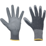 Pletené bezšvové rukavice kategórie prerezu C, sivý PU na dlani a prstoch, pružná manžeta.