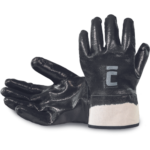 Rukavice šité z bavlněného úpletu, celomáčané v černém nitrilu, s pevnou manžetou.