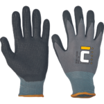 Rukavice z úpletu nylon/lycra máčané v mikroporéznom nitrile, nitrilové terčíky na dlani a prstoch, excelentná priedušnosť, veľmi dobrý úchop za mokra, v olejnatom prostredí i za sucha.