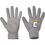 Pletené bezšvové rukavice s obsahom vlákna DYNEEMA a nylonu s vysokou odolnosťou proti prerezu ostrím, s vrstvou sivého PU v dlani a na prstoch.