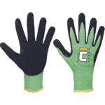 Pletené bezšvové rukavice máčané v mikroporéznom nitrile v dlani a prstoch s ochranou voči prerezaniu F.