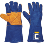 Celokožené zváračské rukavice z hovädzej štiepenky s dĺžkou 35 cm s výstuhou v časti medzi dlaňou a palcom. Šité kevlarovou niťou.