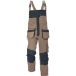 Pánske pracovné nohavice s náprsenkou, 2 odnímateľné multifunkčné vrecká na prednom diele, priestorné spodné vrecká s možnosťou vloženia odnímateľných vreciek, 1 multifunkčné vrecko na ľavej nohavici s pútkom na kladivo, 2 priestorné vrecká na náradie na pravej nohavici, 2 skladané zadné vrecká s príklopkou na suchý zips, zosilnená časť v oblasti kolien s možnosťou vloženia kolenných výstuh, 2 multifunkčné náprsné vrecká, zapínanie na zips kryté légou na suchý zips, nastaviteľná dĺžka trakov, čiastočne elastický pás, bočná možnosť zapínania na džínsové gombíky, spevnenie švov trojitým prešitím, znásobené prešitie v namáhaných miestach, upraviteľná dĺžka nohavíc, reflexívne doplnky v zadnej časti kolien.