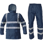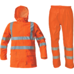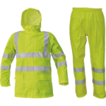• nepremokavý a vetruodolný komplet • 3/4 plášť s kapucňou v golieri a nohavice s gumou v páse • nešuštivý materiál • dve široké predné vrecká kryté légami chrániacimi voči prieniku vody • spodný lem rukávov možno polohovať • HI-VIS verzia len v žltej a oranžovej farbe