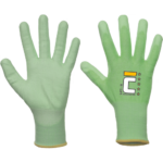 Pletené bezšvové rukavice z jemného 18GG úpletu s vrstvou bieleho PU v dlani a prstoch s ochranou voči rezu D. Rukavice spĺňa Oeko-Tex a je možné v nich ovládať dotykové obrazovky.