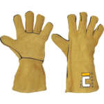 Rukavice zo žltej hovädzej štiepenky s krytými švami šitými aramidovou niťou, bavlnenou podšívkou a v dĺžke 35 cm. Certifikát: zváračské práce – TYP A