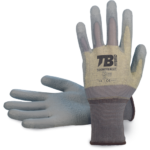 šedé bezšvové nylonové rukavice s paraaramidom; šedé PU na dlani a prstoch; pletená manžeta; hustota úpletu 13 GG