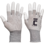 Pletené, antistatické, bezšvové, nylonové rukavice s integrovaným uhlíkovým vláknom, vrstvou polyuretánu na špičkách prstov a pružnou manžetou.