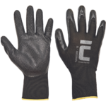 Pletené bezšvové polyesterové rukavice so špeciálnym protišmykovým nitrilovým povrstvením v dlani a na prstoch a pružným nápletom.