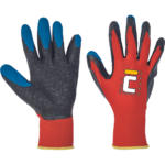 Pletené bezšvové rukavice z polyesteru, polomáčané v latexe (zdrsnená vrstva na prstoch a v dlani), elastická manžeta. Dlhšia životnosť zdvojené máčanie končekov prstov.